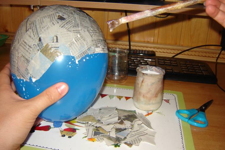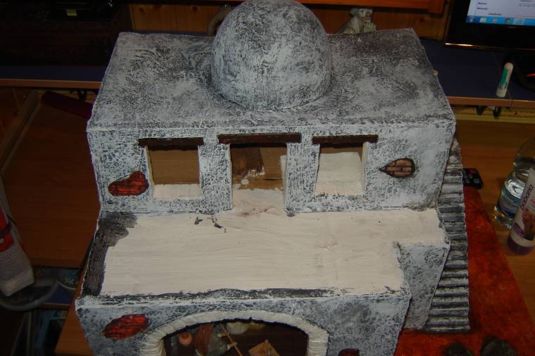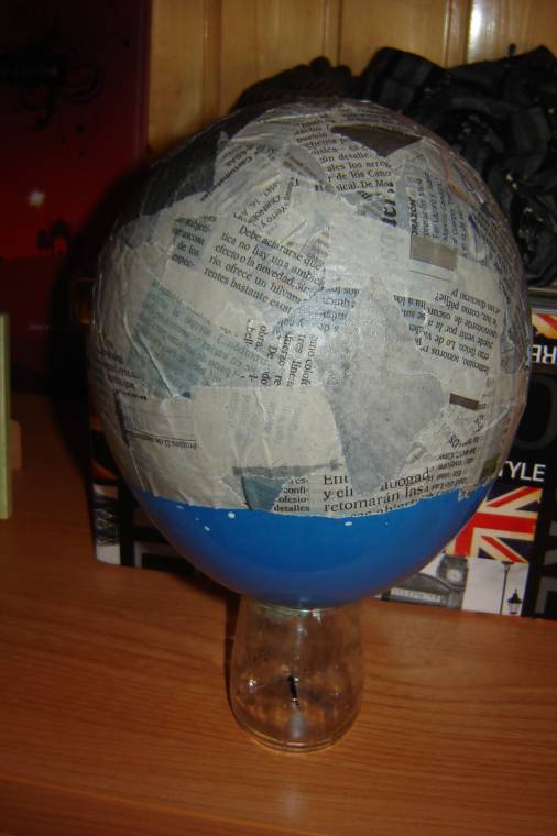 Pero ahora únicamente os quiero enseñar la corona de la casa: la cúpula. Para realizarla he empleado: un globo, papel de periódico, cola blanca y aquaplast. Se hincha el globo a la medida deseada y se va pegando el papel de periódico con cola blanca (que se puede mezclar con agua). Así se repite la operación hasta 5 veces para que quede bien duro. Luego lo más divertido: explotar el globo. Recortar para conseguir la cúpula y colocarla en el sitio deseado. Ahora, lo que hice fue que, con una espátula, recubrí toda la cúpula con aquaplast para que quedase bien dura (incluso aprentando fuerte no se rompe ).
