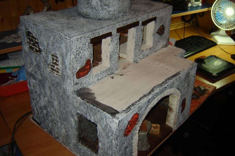 La casa ya tiene primera planta. Ha sido construida del mismo material que la planta baja y las fachadas (tanto la baja como primera plantas) se han esfoscado con escayola mezclada con cola blanca (y agua) y en las uniones se las planchas de corcho (donde éstas se notaban) he utilizado aquaplast (masilla plástica).