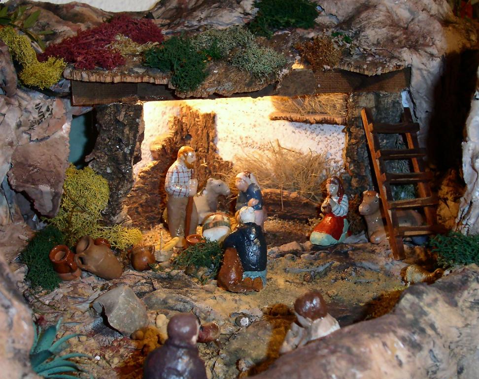 Con todo, mi belén narra toda una historia. Está dividido en dos partes, a la izquierda según se mira hay un corralillo al que se entra a través de un arco más o menos natural. El corralillo tiene el establo comunal, donde se refugia la Sagrada Familia, y una cueva donde se guardan toneles y diferentes enseres. El niño ha nacido y la familia descansa. En la cueva, las mujeres que han asistido al parto charlan mientras una de ellas cose una colcha (regalo para la Virgen) y la otra hila. Unos niños cantan encima de la cueva. Además de la Sagrada Familia, en el establo está el asno y a un ladito, bajo una escalera, el buey. Un niño con un perro mira al niño mientras que una niña toca la flauta. En un rincón, no se ven, hay un viejo con una gaita y una mujer amamantando. Fuera del corral, en el extremo, una madre ayuda a su niña que hace pipí. Es una escena cotidiana, la gente del pueblo reunida en un rincón de las afueras, con una novedad: unos forasteros han tenido un hijo...y un secreto que se intuye: es el Mesías.