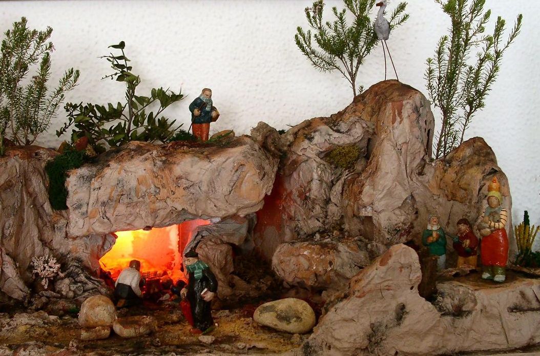Con todo, mi belén narra toda una historia. Está dividido en dos partes, a la izquierda según se mira hay un corralillo al que se entra a través de un arco más o menos natural. El corralillo tiene el establo comunal, donde se refugia la Sagrada Familia, y una cueva donde se guardan toneles y diferentes enseres. El niño ha nacido y la familia descansa. En la cueva, las mujeres que han asistido al parto charlan mientras una de ellas cose una colcha (regalo para la Virgen) y la otra hila. Unos niños cantan encima de la cueva. Además de la Sagrada Familia, en el establo está el asno y a un ladito, bajo una escalera, el buey. Un niño con un perro mira al niño mientras que una niña toca la flauta. En un rincón, no se ven, hay un viejo con una gaita y una mujer amamantando. Fuera del corral, en el extremo, una madre ayuda a su niña que hace pipí. Es una escena cotidiana, la gente del pueblo reunida en un rincón de las afueras, con una novedad: unos forasteros han tenido un hijo...y un secreto que se intuye: es el Mesías.