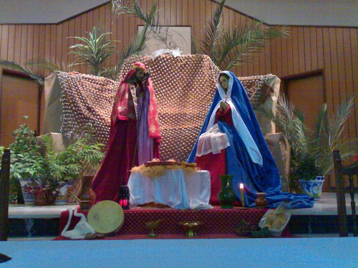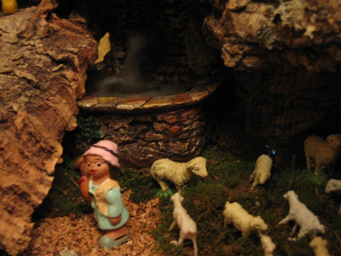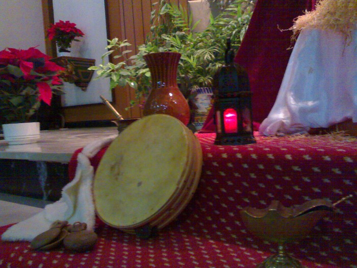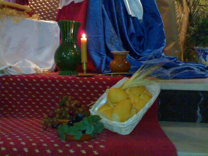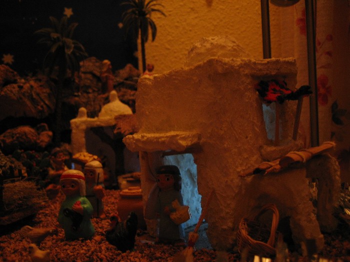 También monto el belén de mi antiguo instituto (ese si está ya más currado), se trata de una colección que la congregación religiosa fue heredando y está compuesto por figuras de olot (ahora mismo no encuentro als fotos, pero si veo alguna os la enseño, si no este año cuando lo monte os subiré alguna). Y también para esta congregación, le realizo "un apaño" simulando un pesebre con unas tallas de un San José y una virgen que tienen en la capilla, por lo que monto un pequeño altar para la capilla que preside las misas (de este si guardo fotos).