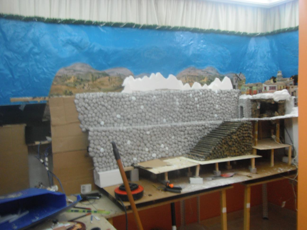 4ª foto: se termina la esquina más lejana y se empieza a hacer el gran muro de piedras (realizadas con porexpán) del frontal principal.