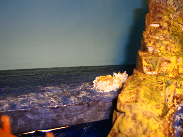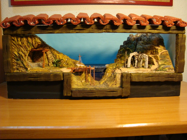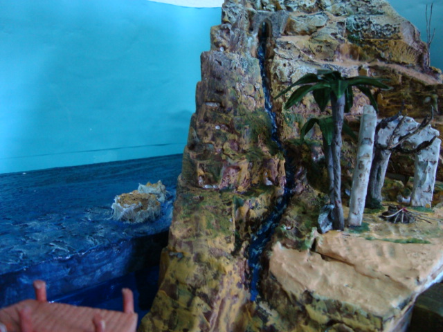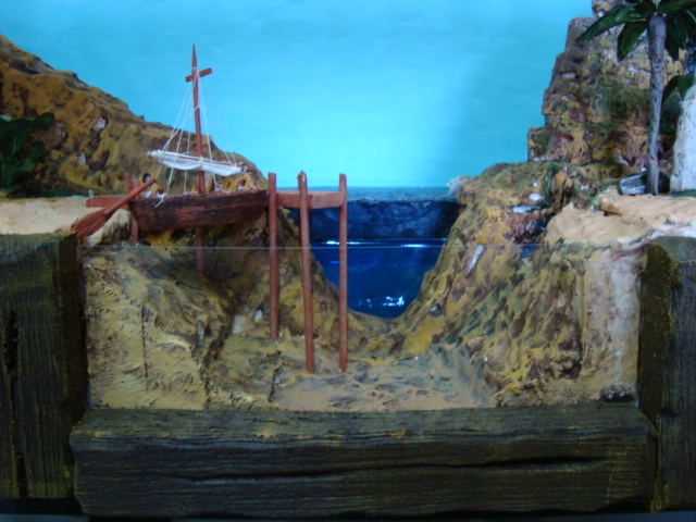 Las figuras de primer plano serán de 15cms. El agua del riachuelo, al desembocar, pretendo que transmita a la barca que estará amarrada en el embarcadero, un leve balanceo. La bomba que alimenta el riachuelo estará oculta, en el estanque central, tras el espigón final de la ladera derecha. Oculto tras el espigón izquierdo, se hallará un nebulizador. Pretendo que la niebla generada, disimule la uníon entre el estanque central y el mar simulado en porex.