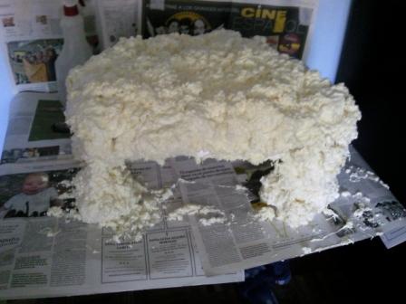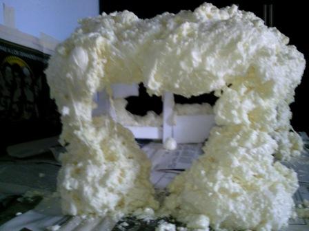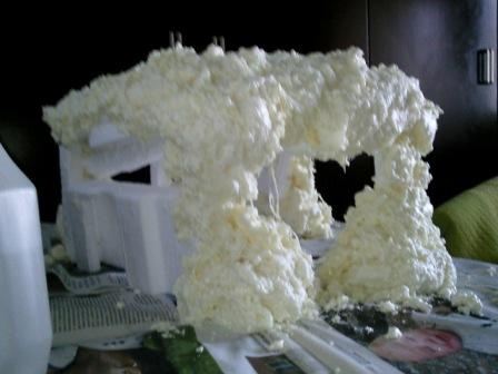 2º con espuma de poliuretano recubrí todo el armazón (seguramente yo no lo hice bien porque tenía más cráteres que la luna. Ver las fotos.