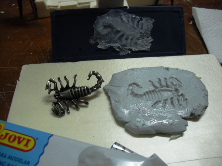El escorpion está en la basura, fue una prueba con silicona y no me gusta, creo que los hare con pasta de modelar o porcelana fria, los queria poner en los lados del dios mono del centro, pero creo que voy a poner otra cosa. (ver foto)