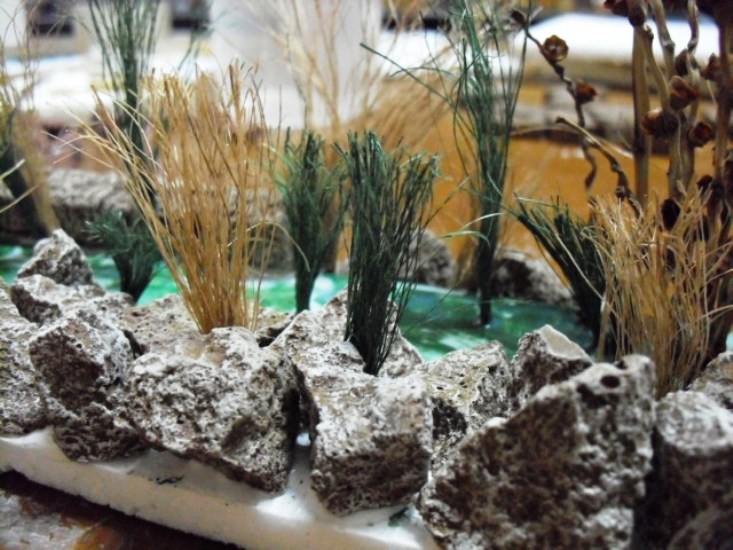 Y ahora pongo unas fotos de como hago las piedras, son de escayola seca, de la que sobra cuando escayolo las construcciones, la guardo y despues la hago trocitos del tamaño que me interesa, se pinta con marron aguado y despues ya le doy la veladura que me interesa segun el color del resto y no pesan nada: