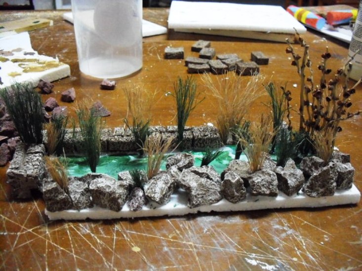 Y ahora pongo unas fotos de como hago las piedras, son de escayola seca, de la que sobra cuando escayolo las construcciones, la guardo y despues la hago trocitos del tamaño que me interesa, se pinta con marron aguado y despues ya le doy la veladura que me interesa segun el color del resto y no pesan nada: