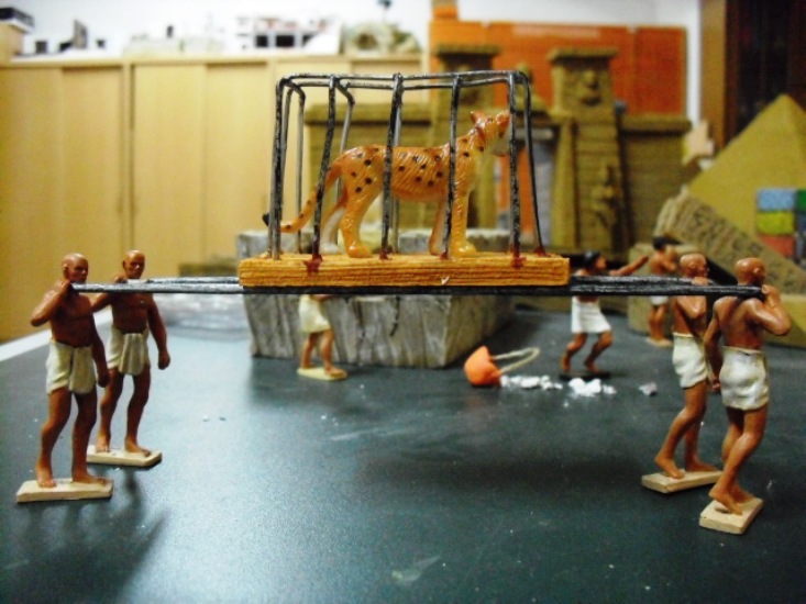 Comparto la opinion de Piña sobre como llevar la jaula..............pero mi idea es mas la que plantea Lluvia, incluso creo recordar que en alguna de mis respuestas ya hablaba de que el leopardo queria que fuese el centro de esta escena, asi que he decidido que los porteadores lo llevaran en alto.