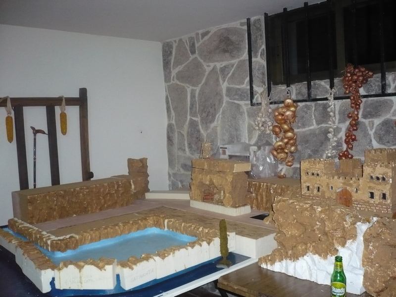 Los bordes son de poliuretano, adaptados al cauce del río y laguna, el acabado arenoso lo relice de forma sencilla, con cola de poliuretano (es impermeable), extiendo la cola por encima del poliuretano y posteriormente lo cubro con arena, queda muy duro y es impermeable, el acabado es muy realista.