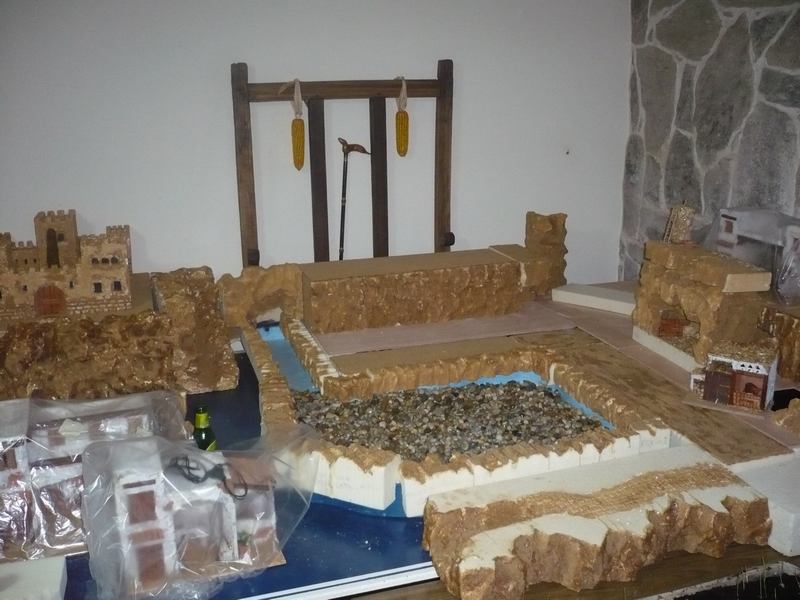 Los bordes son de poliuretano, adaptados al cauce del río y laguna, el acabado arenoso lo relice de forma sencilla, con cola de poliuretano (es impermeable), extiendo la cola por encima del poliuretano y posteriormente lo cubro con arena, queda muy duro y es impermeable, el acabado es muy realista.