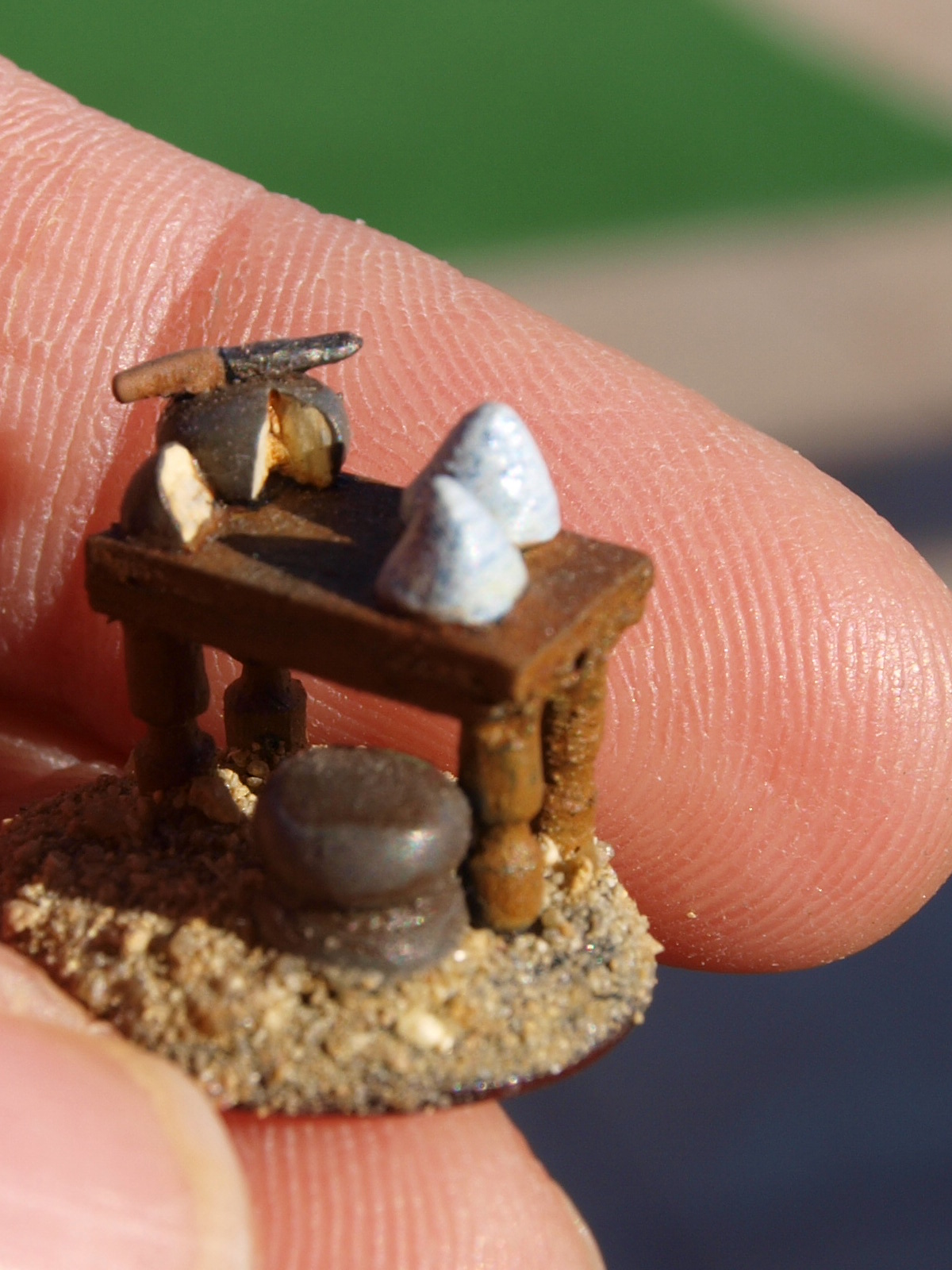 Aquí os dejo algunas fotos. Os cuento que las figuritas las volví a pintar, las vasijas, comida, mobiliario... están hechos a mano con Fimo, apenas miden milímetros. El portal, el puente, el pozo.. también están hechos así, con el mismo material. Ése es el principal inconveniente de este tamaño, no hay nada para completar la escenografía, así que voy poquito a poquito... nunca mejor dicho.