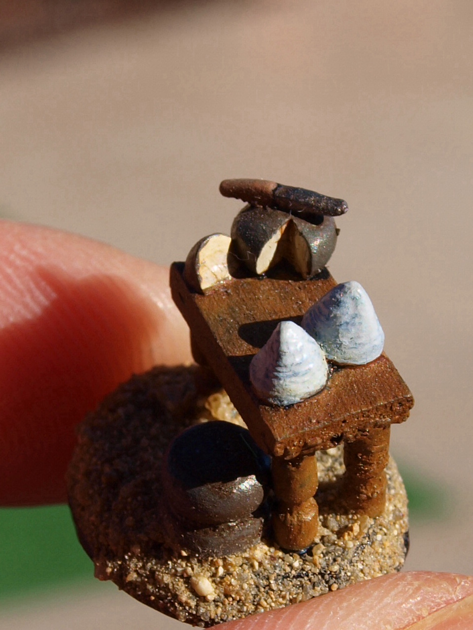 Aquí os dejo algunas fotos. Os cuento que las figuritas las volví a pintar, las vasijas, comida, mobiliario... están hechos a mano con Fimo, apenas miden milímetros. El portal, el puente, el pozo.. también están hechos así, con el mismo material. Ése es el principal inconveniente de este tamaño, no hay nada para completar la escenografía, así que voy poquito a poquito... nunca mejor dicho.