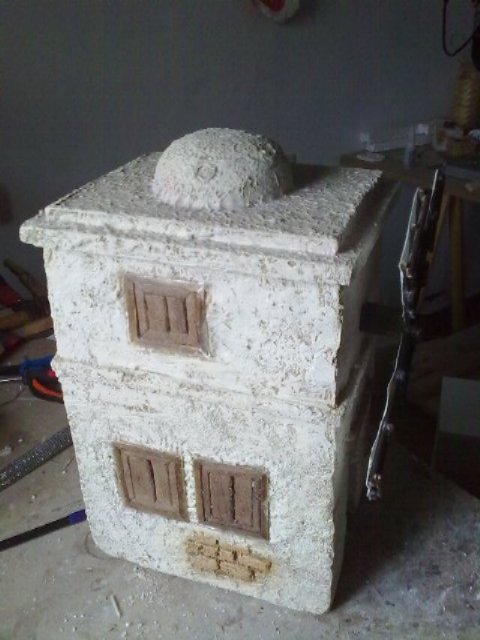 Angel, esta muy bien. Si me permites un consejo. Yo le pondría alguna mancha de humedad por debajo del tejadillo o por cualquier rincón que veas. Mezcla negro con amarillo, o verde con marrón y con el pincel seco ensucia un poco y hazle algún churretón que caiga hacía abajo.