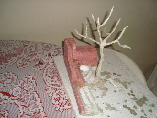 pude subir las fotos. utilice un pedazo de icopor reciclado solo espero vuestras criticas para mejorar, aun me falta terminarlo, en el hueco que se observa habia pensado meter el árbol allí pero el espacio parece pequeño, no se como terminarle alli.