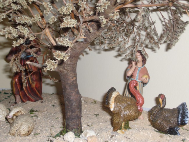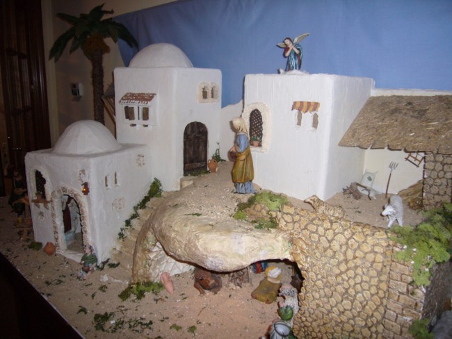 Hola. Hace unos días he conocido vuestro foro y estoy encantado con su contenido. Os envío algunas fotos del Nacimiento que estoy montando para este año. Como podéis comprobar, tengo algunas dificultades con el celaje: he ampliado el tablero y la tela se me ha quedado pequeña; además, la profundidad que tengo (80 cm) es escasa para el tamaño de las figuras (21 cm) que es el que condiciona naturalmente el de las edificaciones y "por imperativo legal" (adivinad de quién) tiene que ser un belén abierto, sin embocadura.