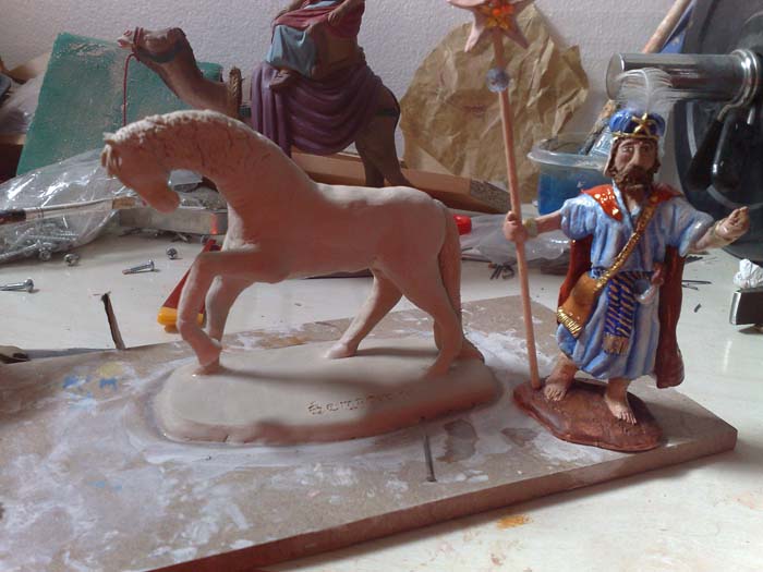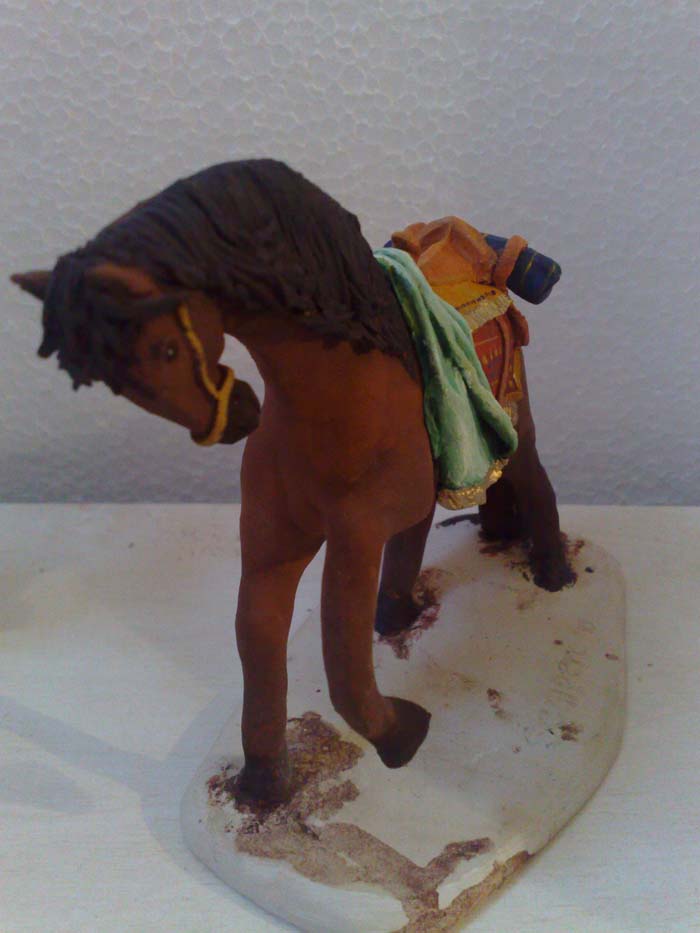 Bueno aqui os pongo mi tercera figura, un caballito que lo utilizare para la cabalgata, sera el caballo del embajador real que claro desde oriente no va a venir andando no? Ayer en una tarde de frio y nieve se me ocurrio hacer esto, para esta figura he utilizado pasta ceramica sio2 plus, la verdad es que parece mas resistente a priori pero la verdad es que la veo mas dificil de trabajar que la jovi (terracota) que es la que suelo utilizar, me gusta mas para los detalles, creo que la utilizare para hacer la montura que intentare que este suelta y se la pueda poner y quitar. Espero que os guste aunque tiene una pequeñita desproporcion en la cabeza que la arreglare poniendole una frondosa melena y en la pata que tiene levantada que es un pelin larga, pero es que no tenia un caballo aqui para medirlo.