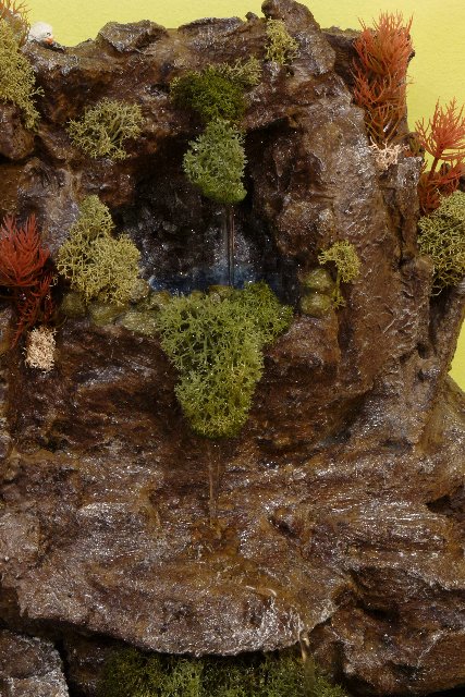 En cuanto a las plantas, es una especie de musgo decorativo que venden estas fechas en el Alcampo, la verdad es que es muy curioso, porque tal y como viene es blandito, pero en cuanto se moja y luego se seca se pone duro, aunque luego se vuelve a reblandecer con el agua, vamos que como lo mojes no vuelve a su estado orginal. Y las de color marrón son plantas de plástico de las que venden para acuarios.