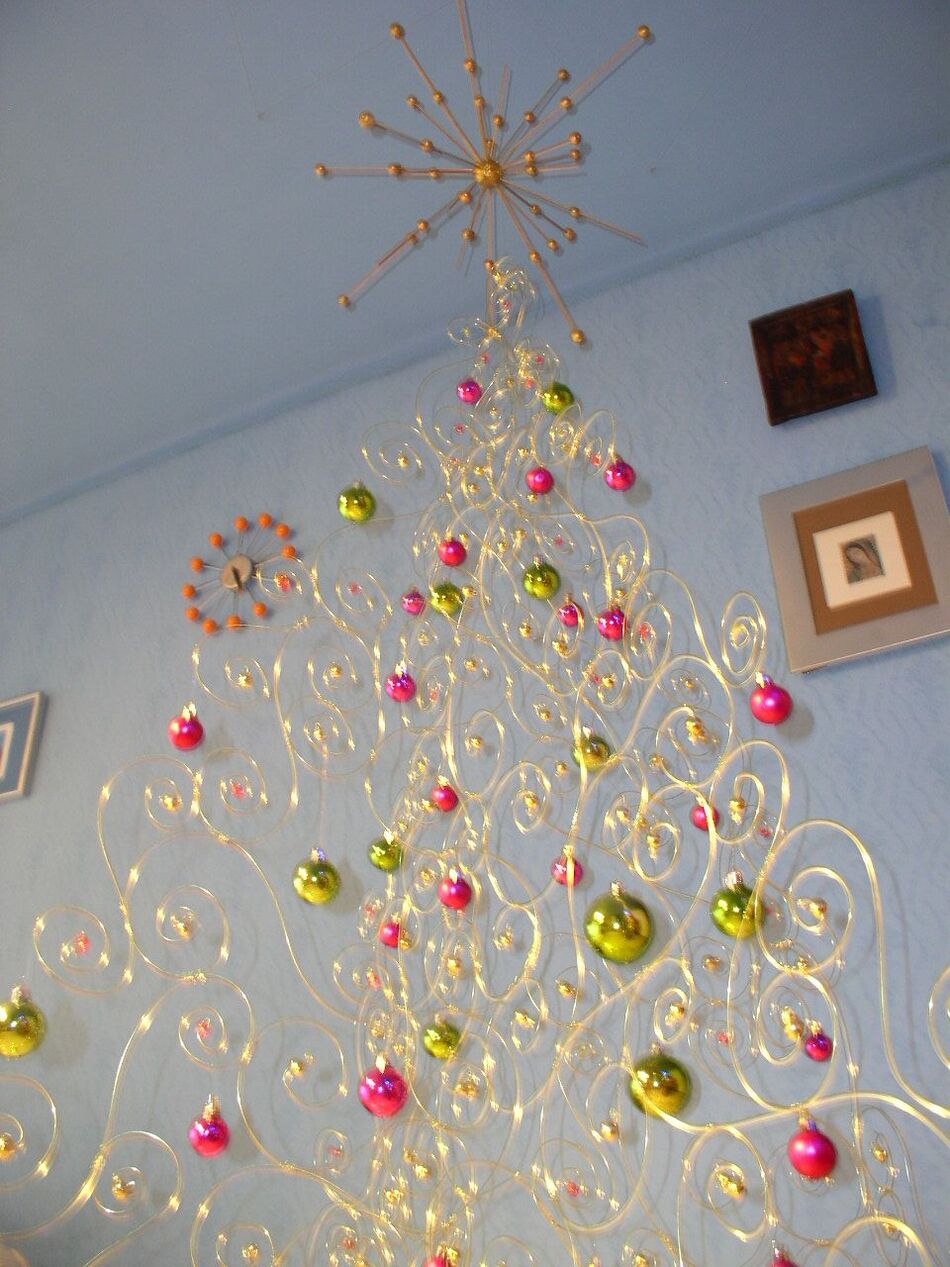Csmd.... no lo venden, bueno si el alambre de aluminio si lo venden, luego a darle forma con alicates y ponerles las perlas en los extremos, unir los arabescos e ir dando la forma de triangulo... son muchas piezas en forma de "S" y luego las uní con alambre del mismo color pero mas fino son dos triangulos grandes que formas el pino colocados en cruz al final colocar las bolas, como esta colgado en el techo con nilon, cuando le da la brisa gira, jejeje y el efecto es muy bonito... Ah y la estrella la hice con palitos de "pinchos" cuentas de madera y algunas esferas de anime o porexpan, pintados con spray color oro. Para el 24 y 25, 31 y 1, y el 6 colocaré una mazeticas color dorado con velas en el suelo para que lo iluminen.