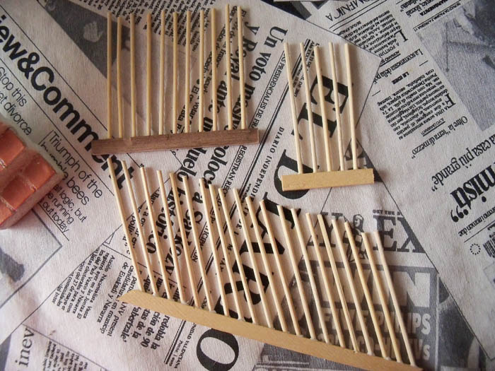 Hice unas baldosas con pasta de modelar color terracota y las pegué a la escalera con aguaplast,después le di barniz poliuretánico brillante¿?(lo descubrí ayer en la tienda de manualidades) y ahora estoy intentando hacer la barandilla por segunda vez *).Me falta hacer el pasamanos y cortar los barrotes a medida.