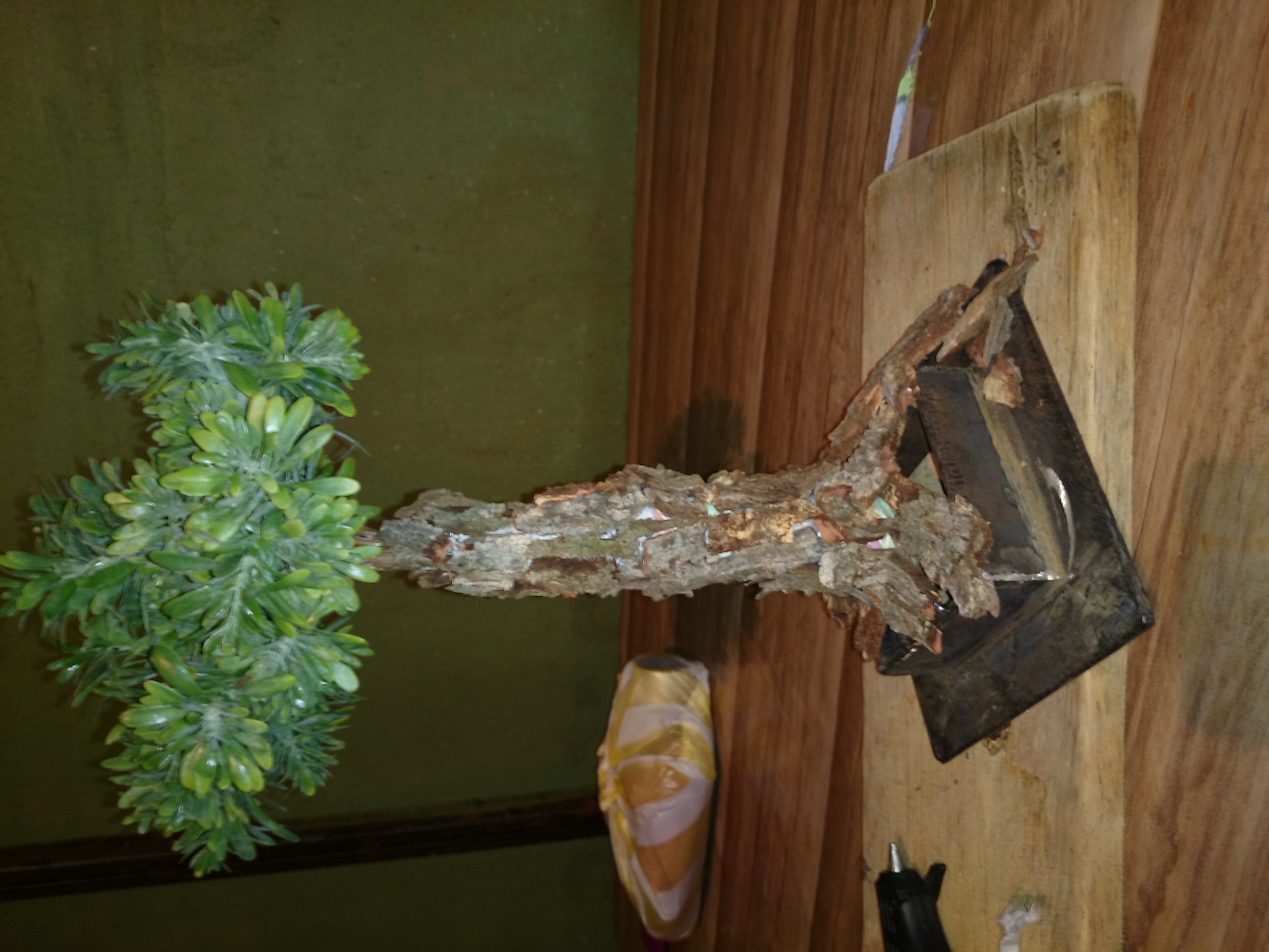 Hola foreros hace algunos días pregunte como quitar brillo a las hojas de plastico, por fin lo he conseguido y empecé con la elaboración de un árbol, la base está hecha de metal y un pedazo de Barilla delgada al que le puse primero el racimo de hojas, después forme con cuerda la Barilla a la que di forma para el tronco, después pegue a la cuerda pequeños pedazos de corteza de un árbol que tengo en una propiedad, esta en proceso espero terminarlo pronto para que vean como ha quedado.