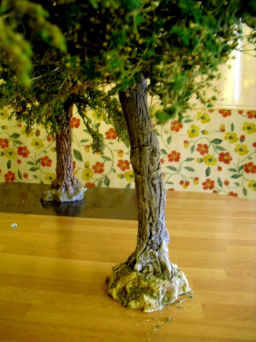 4) pues tienen una altura aproximada de 24 cm o algo más de tronco, pero las ramas caen mucho, me gustan así. Te voy a poner unas fotos de como quedan al lado de la aguadora, es la única figurita que tengo sin guardar, que mide con peana 13 o 14cm, observarás en las fotos que a un árbol le he añadido más masa en la base porque las ramas pesaban demasiado y se caia.