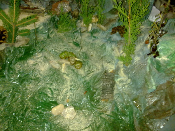 el material usado es corcho aislante de pared, papel de secarse las manos, agua, cola, pintura en spray, una bomba de acuario, y una fila de luces de navidad,
