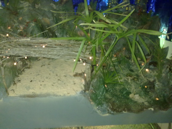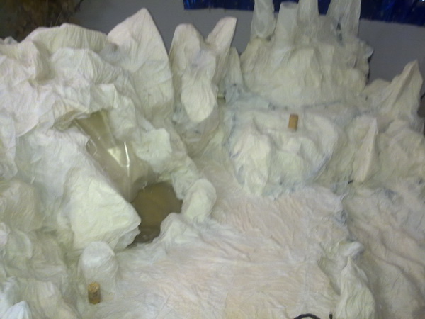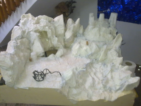 el material usado es corcho aislante de pared, papel de secarse las manos, agua, cola, pintura en spray, una bomba de acuario, y una fila de luces de navidad,