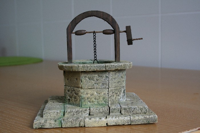 En cuanto a las piedra, puede que tengas razón, pero te explico, el pozo no era redondo sino que tenía 8 lados, es decir la misma forma que tiene ahora, y la unica forma que se me ocurrio de camuflar esa forma tan rara y tan poco habitual en un pozo (que normalmente son redondos) fue hacer grandes bloques de piedra, tenía miedo que si ponía una disposición como la que dices, (que sería la normal en un muro) quedase una forma poco creible al ser un pozo octogonal, por eso tambien utilice bloques grandes de piedra en el suelo y en la parte de arriba, para que todo quedase lo más armonico posible.