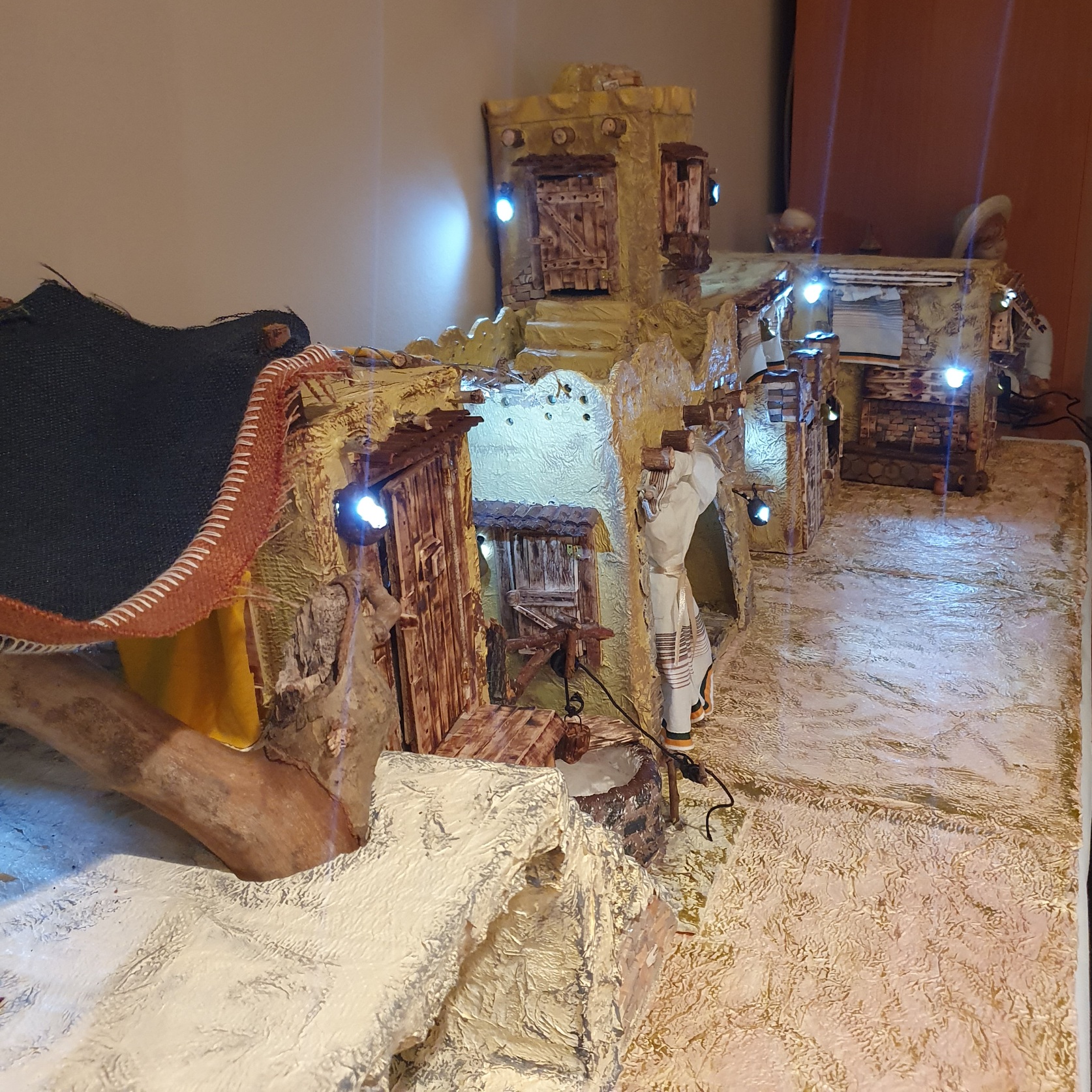 Las luces tienen un papel fundamental en cualquier escenografía. Podría explicarte cómo aplicar la iluminación en el belén, pero lo mejor es que aprendas por ti mismo observando o leyendo sobre iluminación escénica.