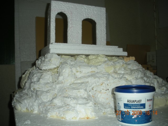 Hola aprendiz, muchas gracias por tu consejo, la verdad es que tienes razón, ahora ya he excavado un poquito en la roca para ocultar la base del castillo, y aún así, cuando acabe el castillo voy a rematar la roca con un poquito más de espuma, cuando acabe esto, ya pondré las fotos. En cuanto al material que he usado, parte de ella está hecha con el producto que veis en la foto y también con yeso fino. Yo puedo permitirme el lujo de utilizar estos materiales, porque durante todo el día soy secretaria de una empresa de construcción, y las dos oficinas en las que estoy, están en la propia obra, entonces tengo acceso a ellos, la verdad es que es una suerte. Ah! los escalones están puestos una vez que la espuma se secó y hice los cortes que me venían a la cabeza, así que para cortar el poliexpan, tuve que ir amoldándome al hueco, y si me hacía falta, pues retocando la espuma. La verdad, es que es la segunda vez que me meto en un berenjenal como este, pero tengo un pequeñín de 5 años y a él le encanta pues hay que ponerse manos a la obra. Saludos y muchas gracias a todos por vuestros comentarios, no sabéis lo que eso me anima para seguir con las cositas. Cuando esté terminado prometo poner fotos para que me digáis lo que os parece.