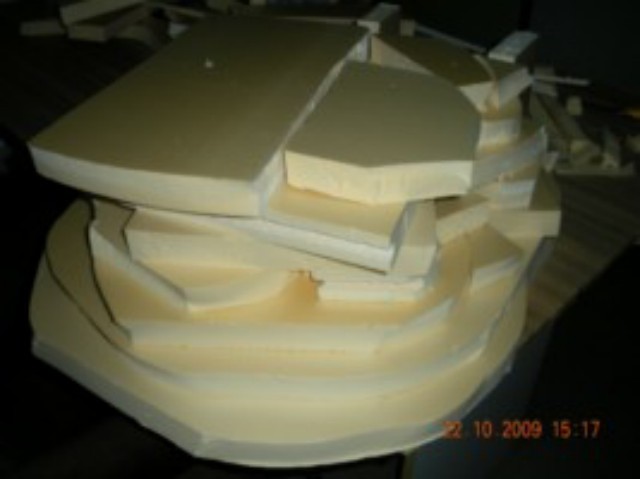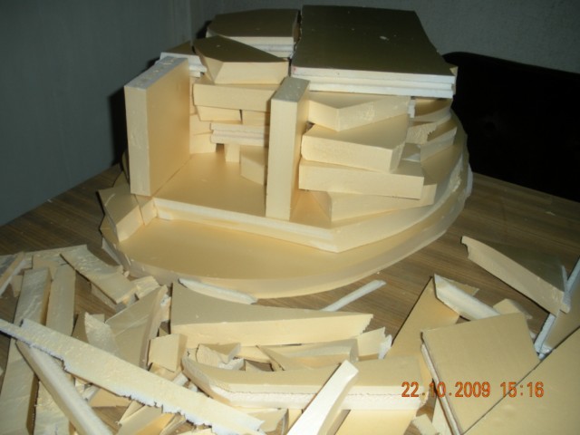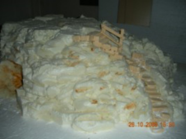 Esta hecha con espuma de poliuretano y una base de retales de porex, en principio con los recortes yo ya le di la forma de la entrada lo cubrei de espuma sin tapar la entrada y el resto como quedo la espuma excepto las escaleras que estan talladas con el cuter.