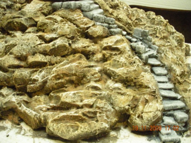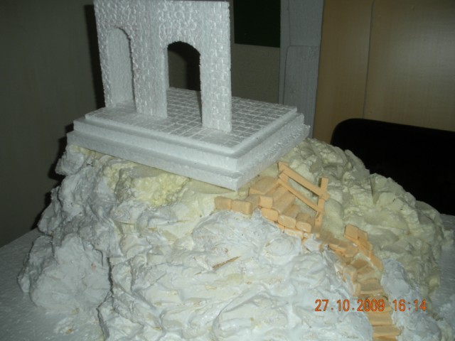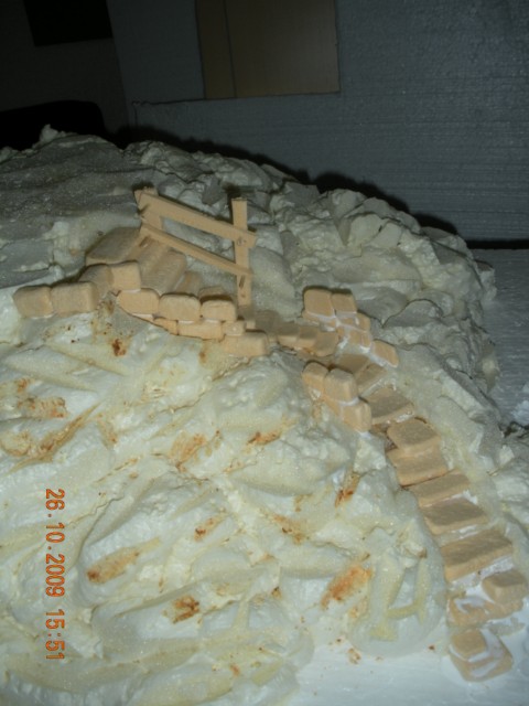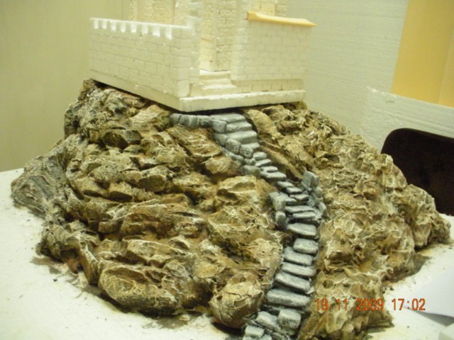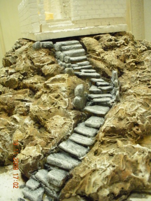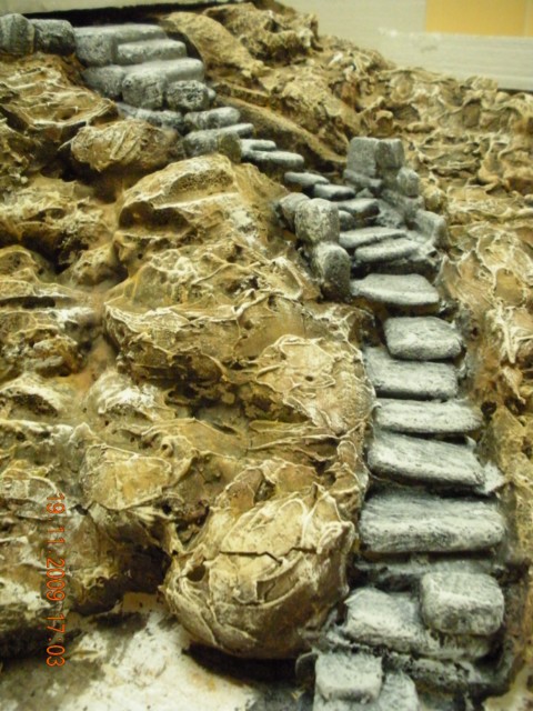 Está preciosa. Un poco de musgo, algunos arbustos y ocultar la base de la construcción y listo. Enhorabuena me gusta mucho. Por cierto ¿las escaleras las has colocado con la espuma aun fresca o has esperado a que se secara? Si es esto último, ¿has tenido que recortar con el cuter para que te encajaran los escalones?