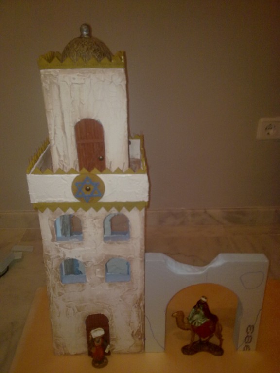 Bueno, bueno, por fin voy viendo la luz al final del camino. Os cuento: me decidí por la cúpula, la de siempre vamos. Lo que veis en las fotos son los balcones, falta el de la fachada principal, a la que le tengo que pegar la estrella de David que hice con porexpan. Lo del aquaplas lo solucionaré mañana, haré una pequeña prueba de pintura en alguna zona que no se vea mucho y si no resulta pues escayola o aquaplas en polvo con cola, como habeis sugerido. Ya os iré contando, de momento unas fotillos... Un saludo a tod@s