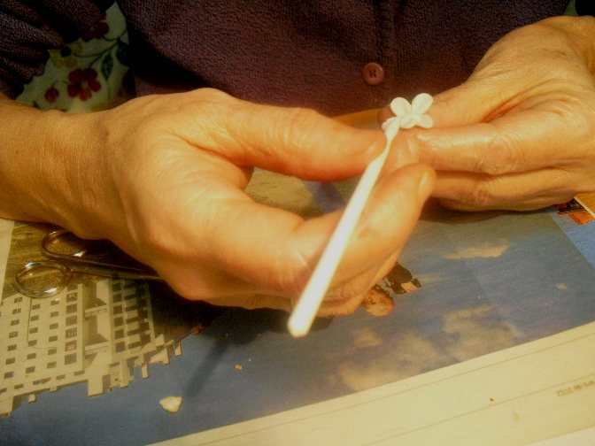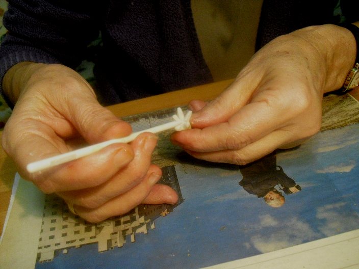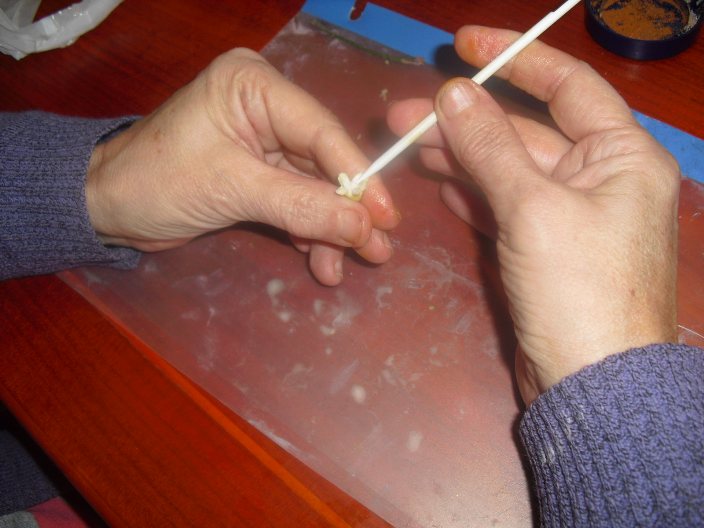 Hola PIlar, los pistilos los hago con hilo de pescar que ya sabes que es muy finito y transparente, luego quemo las puntas, quedan unas bolitas y con un pco de cola laspaso por canela, o bien le doy un toque rosado, según el tipo de flor.