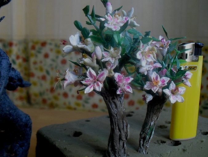 Hola a todos, subo unos mini almendros que he hecho recientemente; las flores, troncos, etc ..son de porcelana fria y hago un mini pap por si a alguien le interesa como se hacen las flores de cinco hojas. Las fotos no son muy buenas, pero no sé hacerlas mejor. El misterio mide 3,5cm.