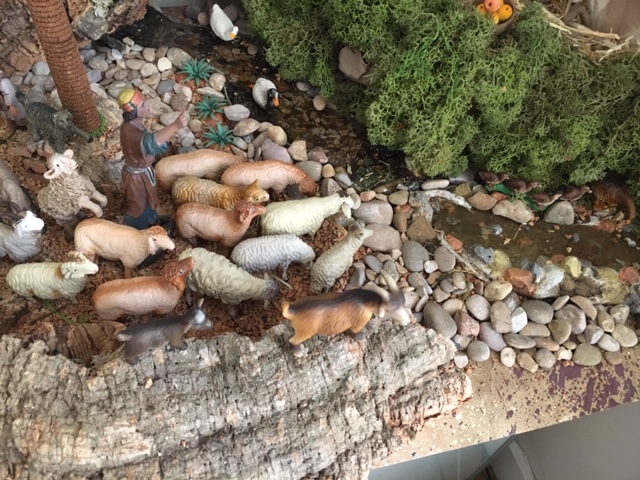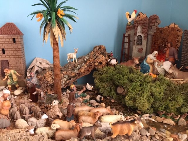 Belen de 50 x 70 cm con figuras mezcladas, de H. Castells, Olot, Mayo y animales diversos de barro y de plástico de Schleich. Palmera y plantas del río de Artesanía Bertran