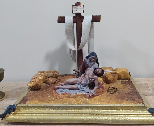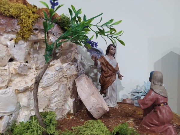 Aprovechando que me sobraba bastante porex, y un regalo adelantado,en el mes de Febrero (regalo de mi mujer, una preciosa Piedad de Mayo de 16 cm), he realizado dos dioramas de sobremesa, uno reprentado el Calvario tras el descendimiento, y otro el ángel anunciado la resurreccion a una de las mujeres.
