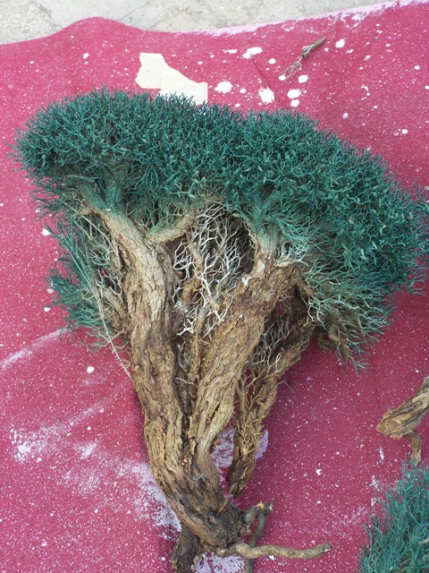 esta hecho de Socarell(Centaurea Balearica).Es una planta que no crece mucho,lo que hace grande matas.El tronco es parecido al del romero.Antiguamente se ponia en los canalones que recogian el agua de lluvia de los tejados y servia de filtro pues es muy tupida y espinosa.Decirte que esta especie es endemica de Menorca,sobre todo en la costa Norte