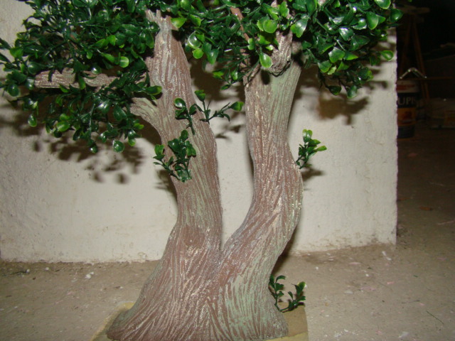 gracias a todos...............que way que a todos os a gustado,silvia,para poner mas ramas coges alanbre lo trenzas y luego lo forras de papel de cocina,lo dejas secar y luego lo cortas con las tenazas a la medida deseada,luego haces agugeritos en las ramas donde desees y metes los trozos que has cortado con un poquito de cola blanca,lo dejas secar y luego lo pintas todo como el tronco,cuando este seco solo hace falta poner las hojas,estas son de un motivo floral que he comprado en unos chinos,lo que pasa es que este porex es de 8 cm,me lo dio un vecino de una obra,pero ademas de esas ramas de alambre he tenido que poner mas de porex,pero bueno,que os ha gustado y eso me da ilusion para seguir poniendo fotos de otras cosas,saludos y gracias a todos