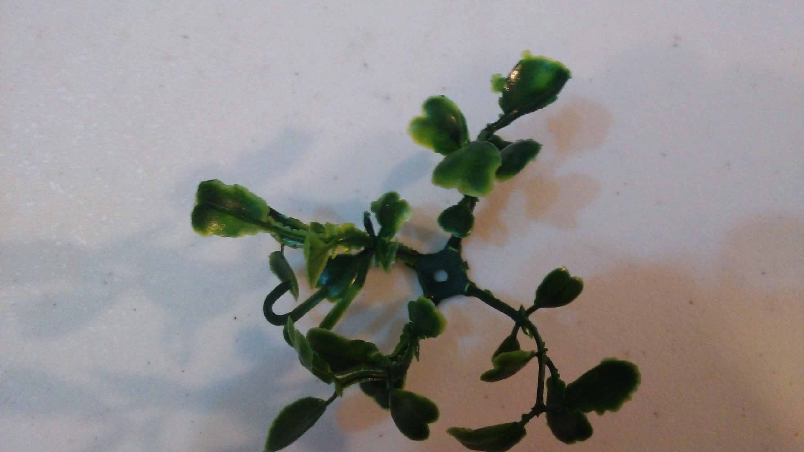 Compré una bola de esas de plástico y la desmonté. Te quedan un manojo de hojas con un agujero en el centro que es el que utilizo para luego insertarlo en las ramas del árbol.