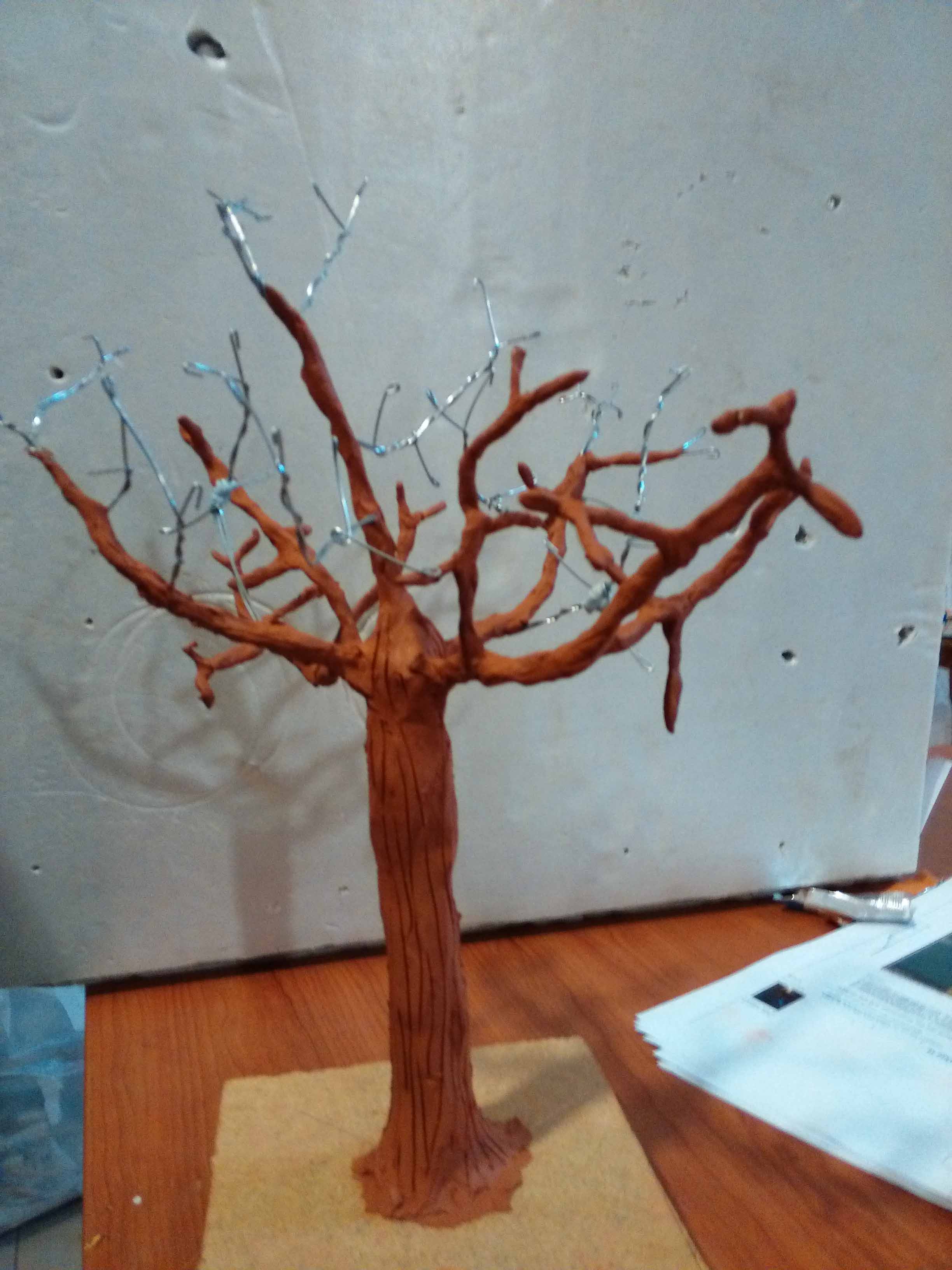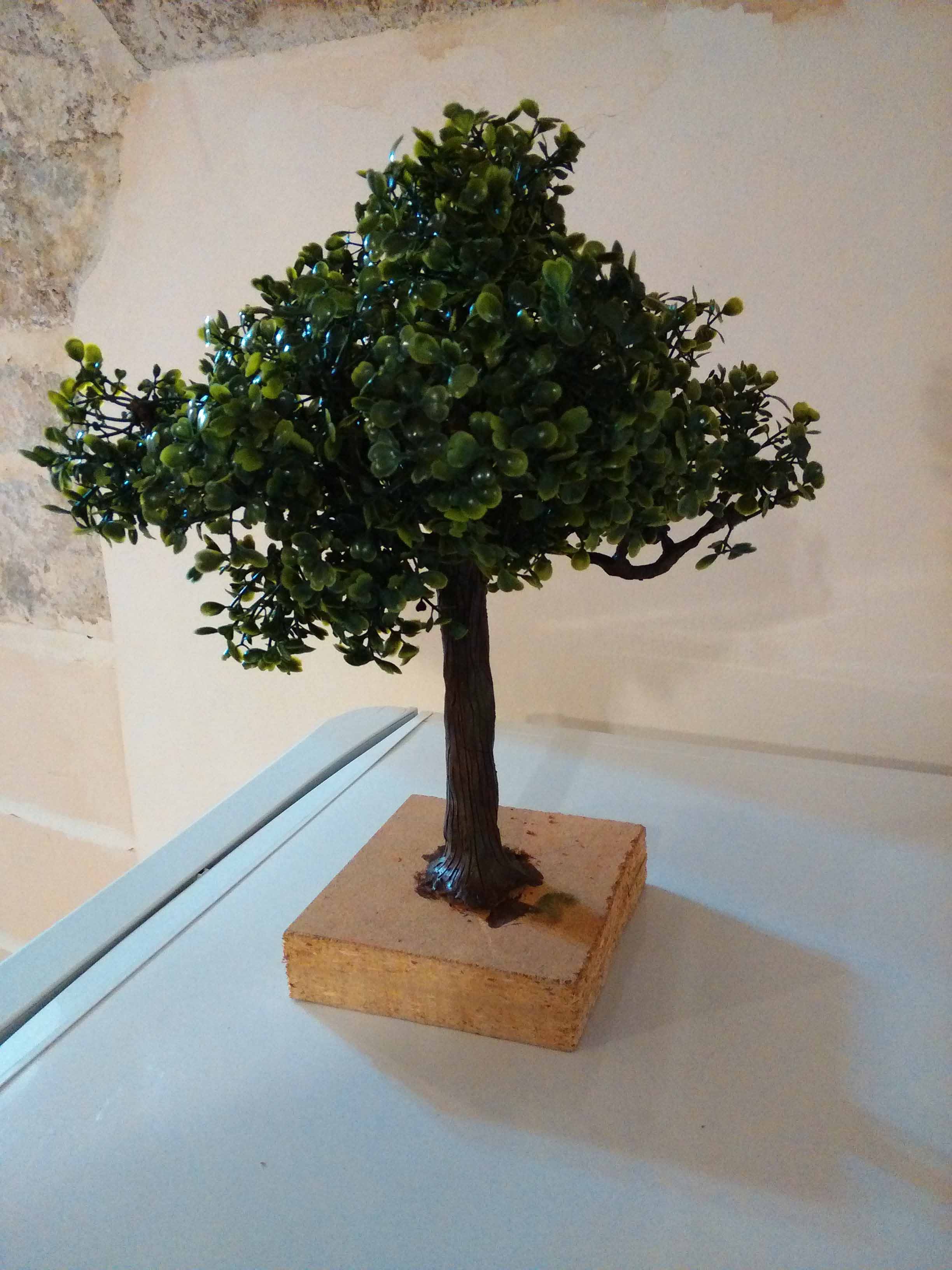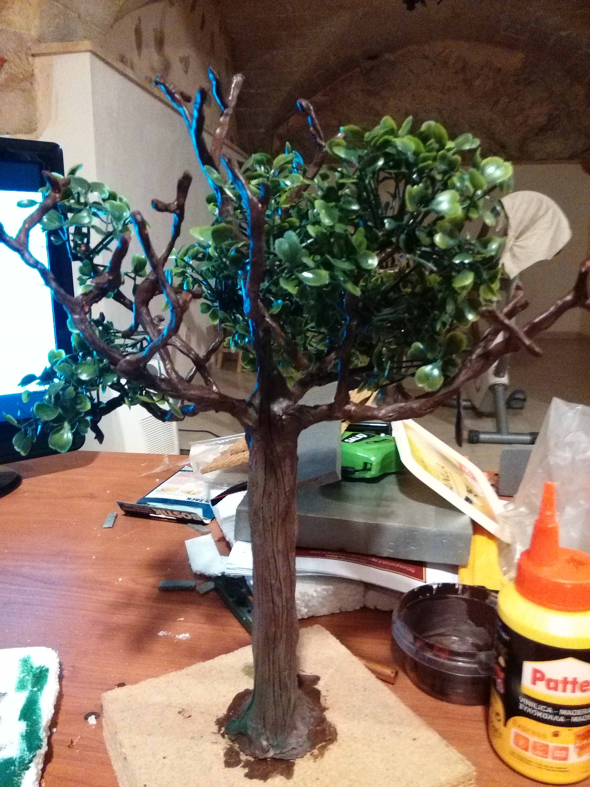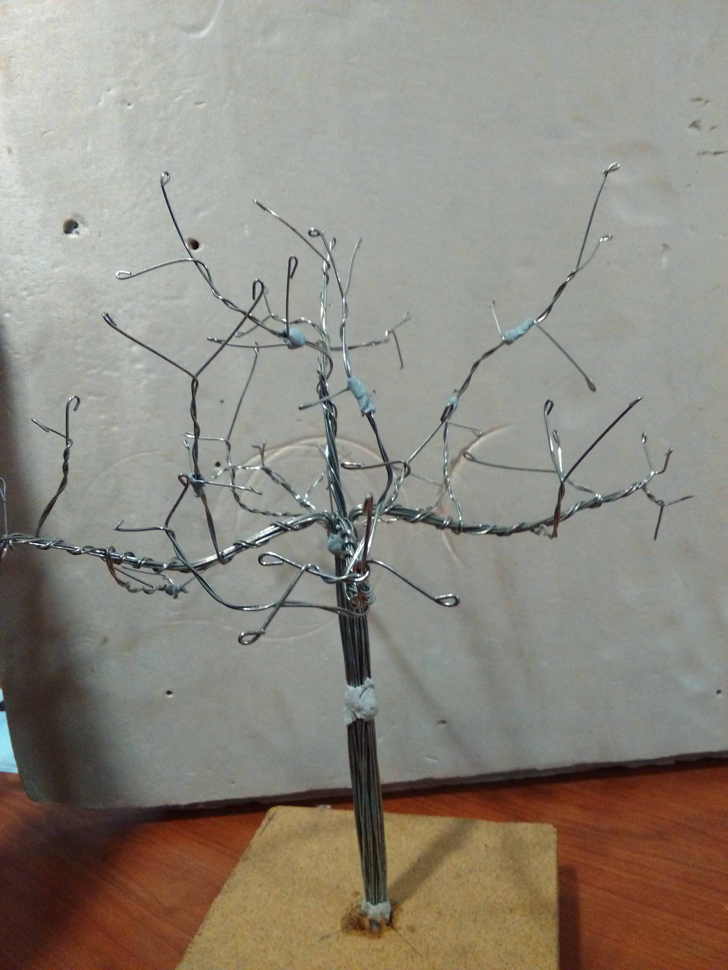 Compré una bola de esas de plástico y la desmonté. Te quedan un manojo de hojas con un agujero en el centro que es el que utilizo para luego insertarlo en las ramas del árbol.