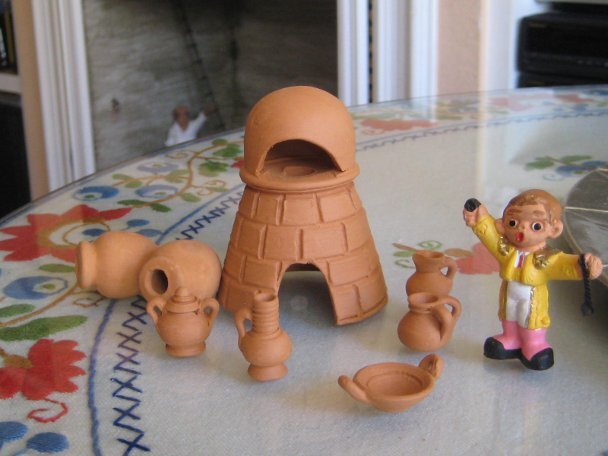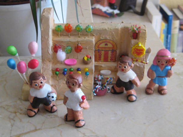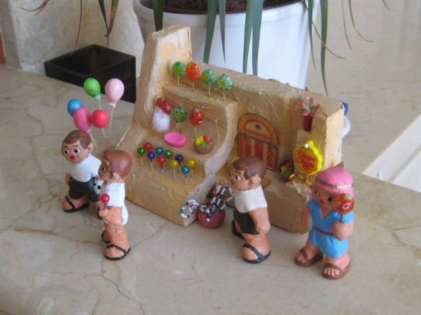 Pili a la Virgen en una casa un poco más alta, sino se tiene que agachar para pasar por la puerta. La idea del herrero esta muy bien. El puesto de chuches, como ya te lo han dicho, de dulce (o sea perfecto)