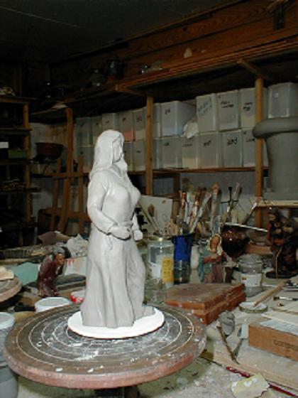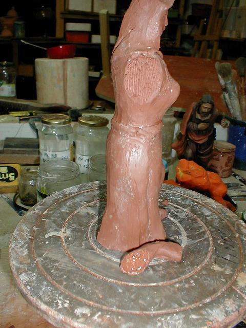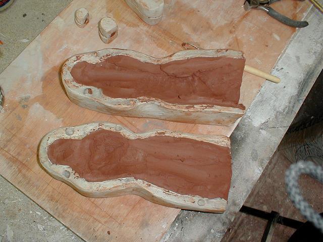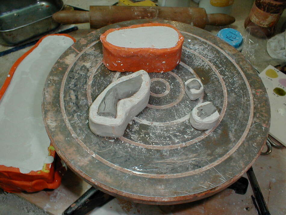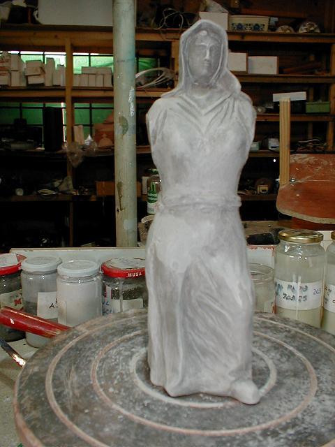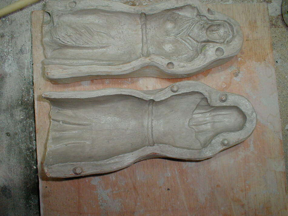 91.- Ya se ha sacado una mitad de la figura, a esta mitad se le levanta pared para echar la escayola, previo haber untado barbotina a la figura para que se pueda despegar la escayola.