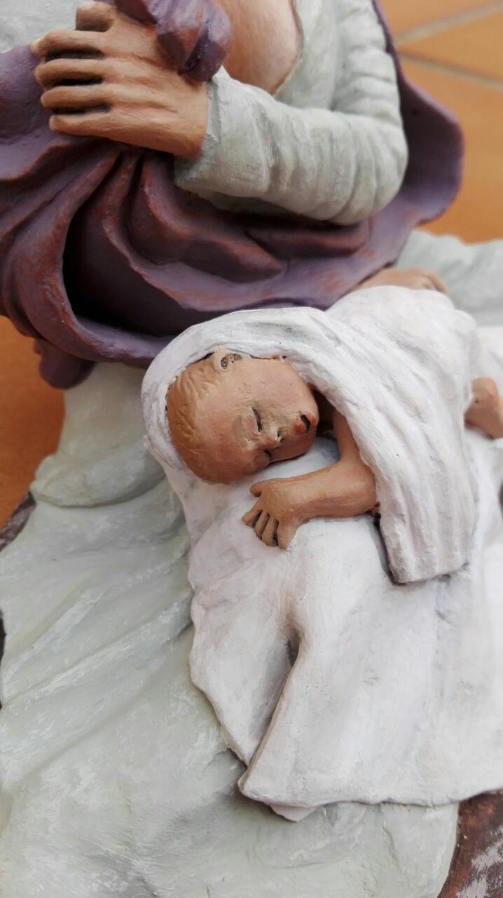 Este año me he embarcado en la realización de un misterio hecho con pasta Das Terracota. Ahí es nada. En vez de empezar con unas ovejitas o algún pastor, he tenido la osadía de comenzar directamente con un misterio. Zas, directamente a la piscina y sin salvavidas jaja. El misterio es de 25 cm aprox y policromadas al acrílico. Me gustaría saber vuestras críticas y opiniones para seguir aprendiendo y mejorando para futuras creaciones. Hay que tener en cuenta a la hora de valorar las que de modelado de figuras no tengo ni pajolera idea y es mi primera vez frente al barro.