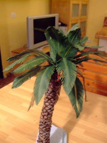 Pastornika, los trozos de piña estan pegados solo con cola blanca, de la que al secar se queda transparente. Al igual según en que bases uses como tronco sea más dificil el que se pegue, en mi caso como ya comente use una caña que ya estaba teñida para adorno por lo que los trozos de piña junto con la cola se resbalaban y no quedaba ninguna en el sitio , para evitar que resbalaran enrodille la caña con una gasas (de esas para curar heridas, puede servir vendas) y asi ya no resbalaban. En cuanto al paso a paso si me das un poco de tiempo, ya que ahora tengo mucho trabajo en la oficina, lo hare. Tengo una serie de palmeras que por falta de tiempo se quedaron sin montar y podre realizar el paso a paso. Antes del pap te pondre unas fotos de los trozos de piña cortados, ya que al igual dejas los trozos muy largos.
