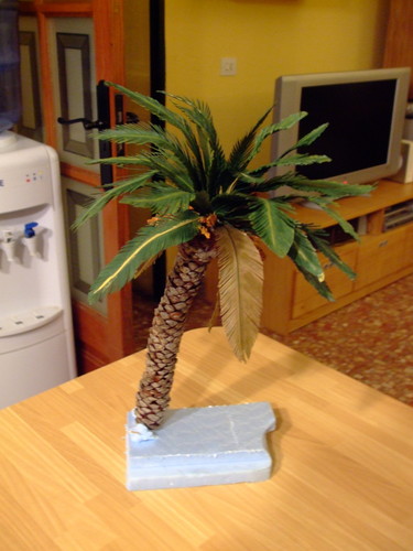 Pastornika, los trozos de piña estan pegados solo con cola blanca, de la que al secar se queda transparente. Al igual según en que bases uses como tronco sea más dificil el que se pegue, en mi caso como ya comente use una caña que ya estaba teñida para adorno por lo que los trozos de piña junto con la cola se resbalaban y no quedaba ninguna en el sitio , para evitar que resbalaran enrodille la caña con una gasas (de esas para curar heridas, puede servir vendas) y asi ya no resbalaban. En cuanto al paso a paso si me das un poco de tiempo, ya que ahora tengo mucho trabajo en la oficina, lo hare. Tengo una serie de palmeras que por falta de tiempo se quedaron sin montar y podre realizar el paso a paso. Antes del pap te pondre unas fotos de los trozos de piña cortados, ya que al igual dejas los trozos muy largos.