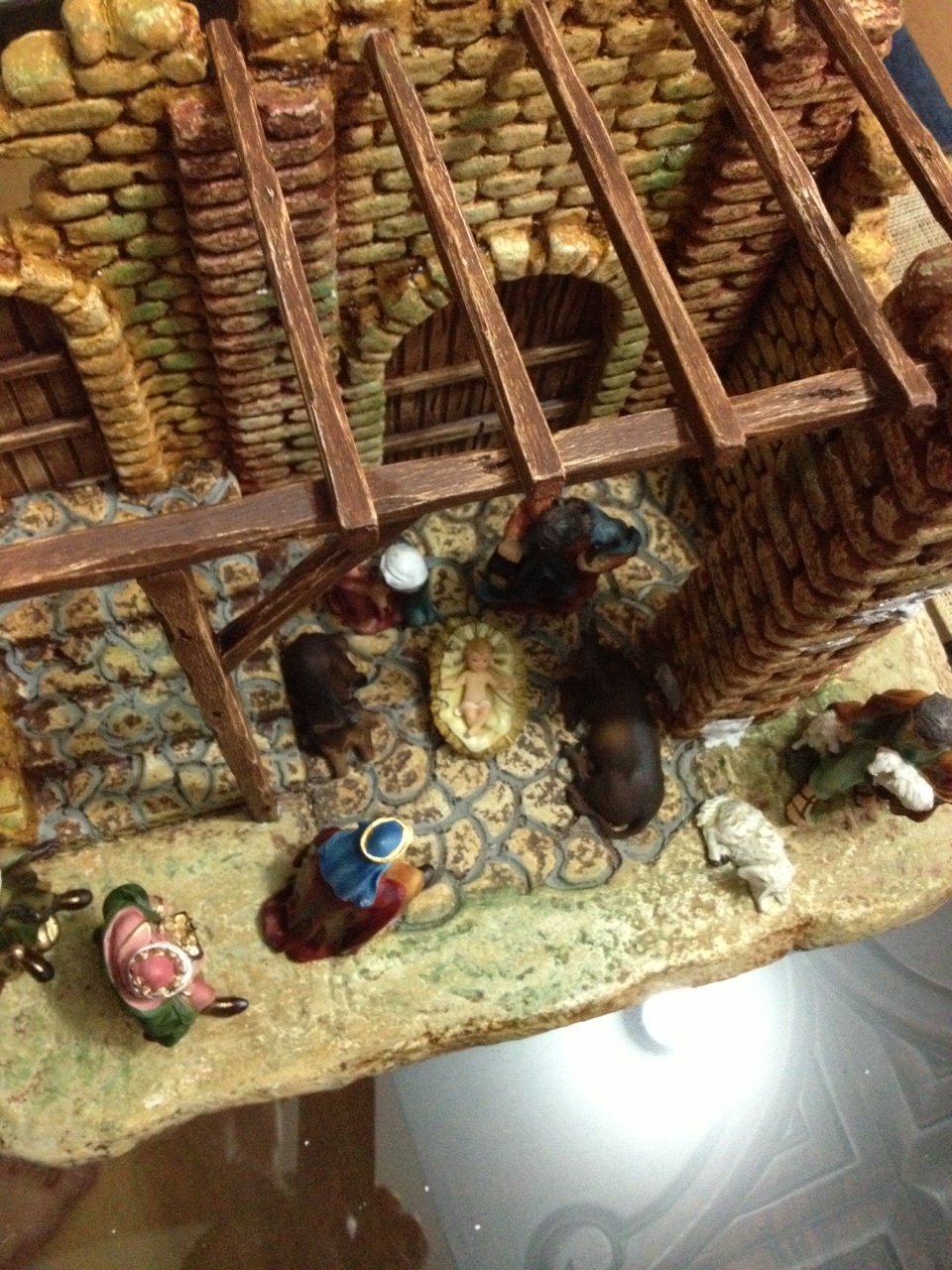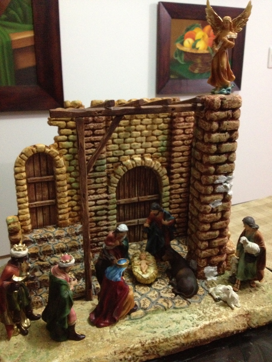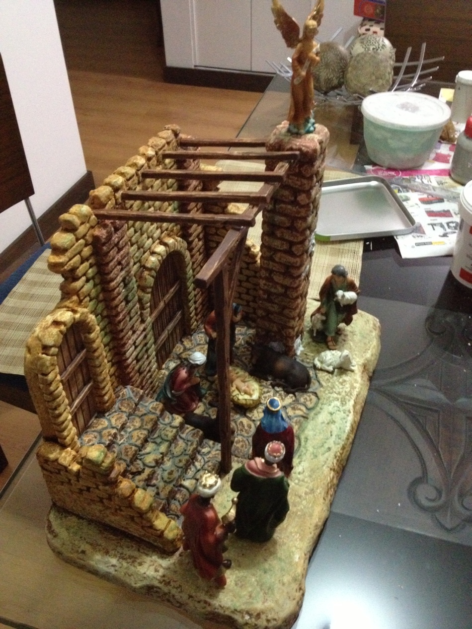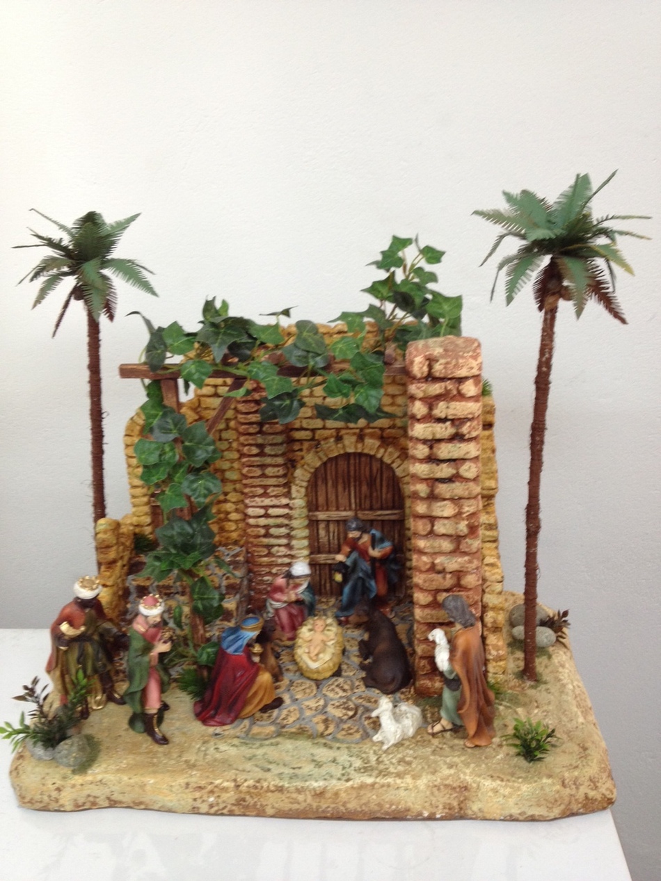 ...estupendo...no obstante, el Ángel lo veo demasiado alto, al igual que el techado de vigas de madera y por otra parte, las hojas de la enredadera, desproporcionadas en su tamaño. Pero bueno, para ser trabajos primeros no está nada, pero nada mal. Igual el año próximo corriges detalles y en definitiva, vas aprendiendo con la práctica. Como todo en la vida.