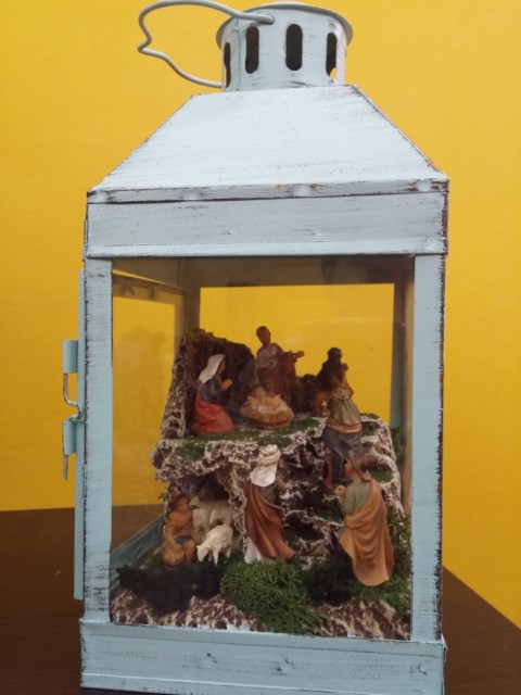 Se me olvido este, dentro de un farol pequeño, con figuras de 4,5 cm. y luz.