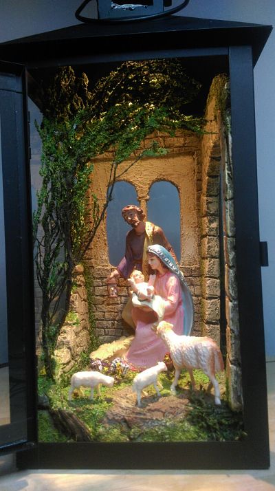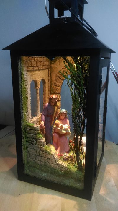 Hola amigos foreros belenistas. Adjunto las fotos de un pequeño nacimiento compacto de 13 cm dentro de un farol de 23 cm de alto X 13.5 cm de ancho x 13.5 cm de profundo.