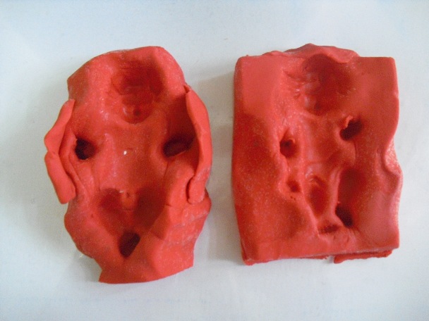 Para hacer figuras, animales o cualquier otra cosa se puede usar la plastilina corriente, para ello yo hago el molde de lo que quiero copiar y lo meto en el congelador del frigorífico una media hora más o menos; así sale completamente rígido y paso a rellenar con escayola o masas. Una vez qu está seca la copia es muy fácil de desprender puesto que la plastilina ya se ha reblandecido.